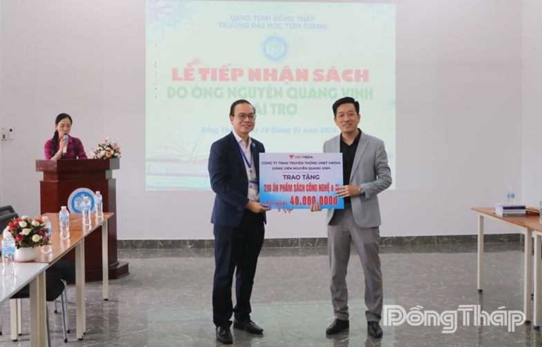 Nhằm góp phần bổ sung nguồn học liệu phục vụ học tập, nghiên cứu và lan tỏa văn hóa đọc trong môi trường đại học, chiều ngày 16/01/2026, Trường Đại học Tiền Giang tổ chức tiếp nhận nguồn sách do ông Nguyễn Quang Vinh trao tặng, đồng thời phối hợp tổ chức buổi chia sẻ kinh nghiệm về ứng dụng trí tuệ nhân tạo (AI) trong học tập và nghiên cứu dành cho sinh viên tại Thư viện của Trường.